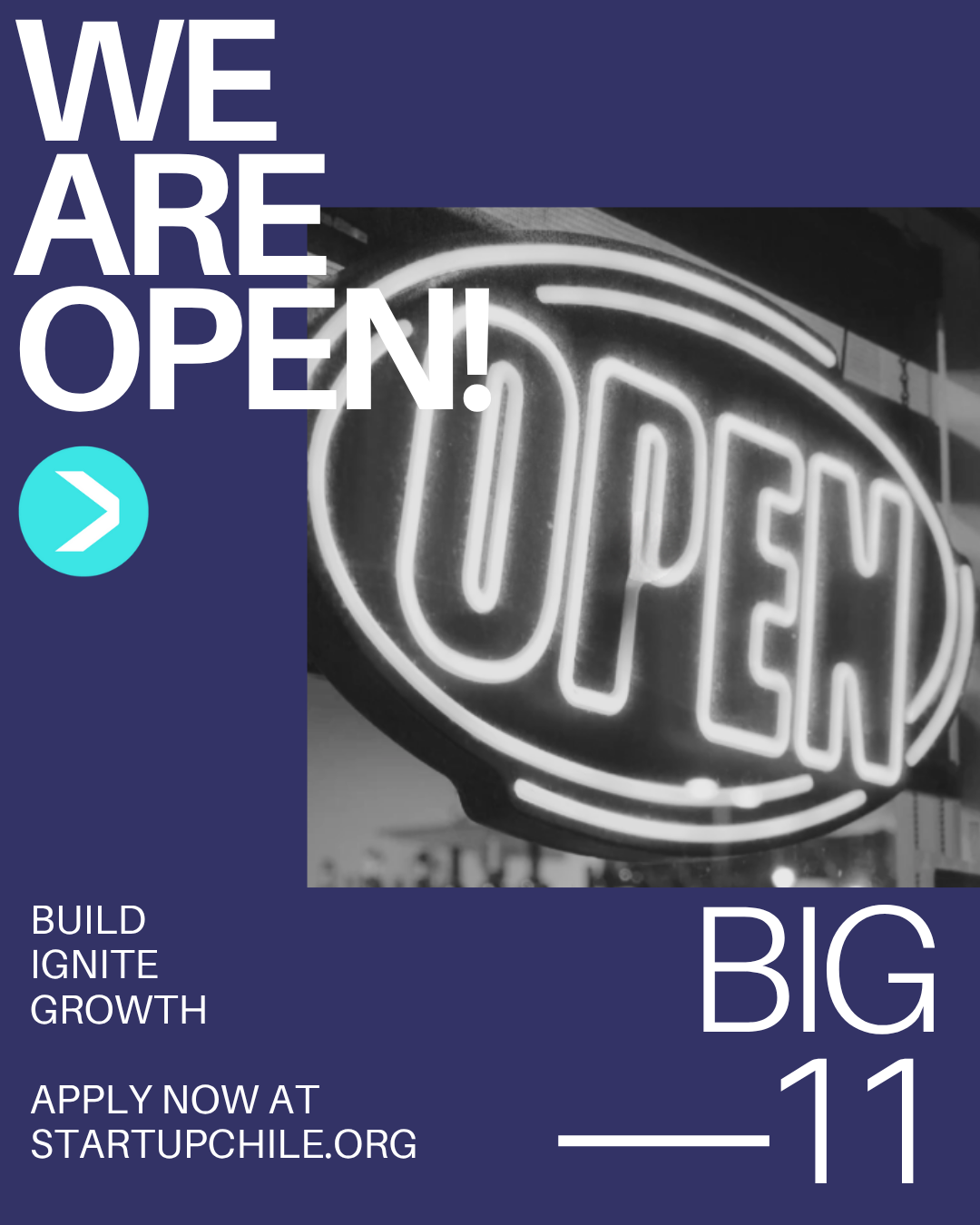 Start-Up Chile est谩 con convocatoria abierta para la generaci贸n BIG 11. Puedes postular a los programas de aceleraci贸n Build, Ignite y Growth, seg煤n tu nivel de desarrollo, hasta el 28 de noviembre.